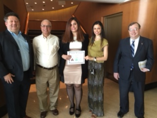 On May 20, the Al Alawachi family became U.S. citizens at the City Municipal Complex in Detroit. After the ceremony, they posed for a photograph together to commemorate their achievement. In the picture above, Farah (center) holds her Citizenship Certificate and poses next to her father, Foud Abdulhussein (left) and her younger sister, Amel (right), along with the Wojciech Zolnowski (far left), Executive Director of the International Institute of Metropolitan Detroit and Robert Sullivan (far right) the Director of Career Development at the International Institute of Metropolitan Detroit.